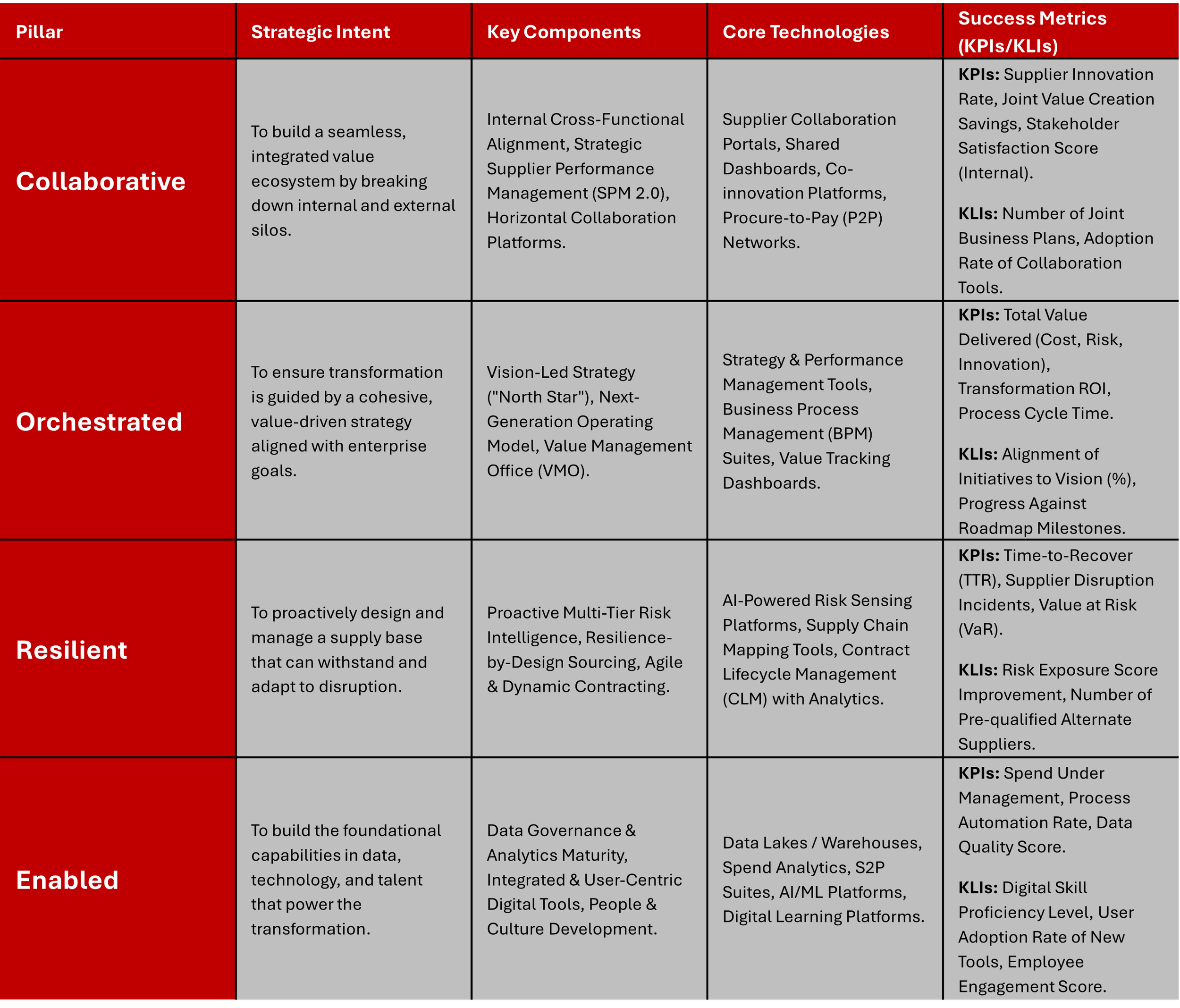 This framework re-casts procurement not as a component of the transformation, but as its central nervous system. It provides a structured, holistic, and actionable model for procurement leaders to seize control and guide their organisations toward a future state of digital maturity. The four pillars of the C.O.R.E. framework are not sequential stages but rather four interconnected and mutually reinforcing capabilities that must be developed in parallel to achieve breakthrough performance.