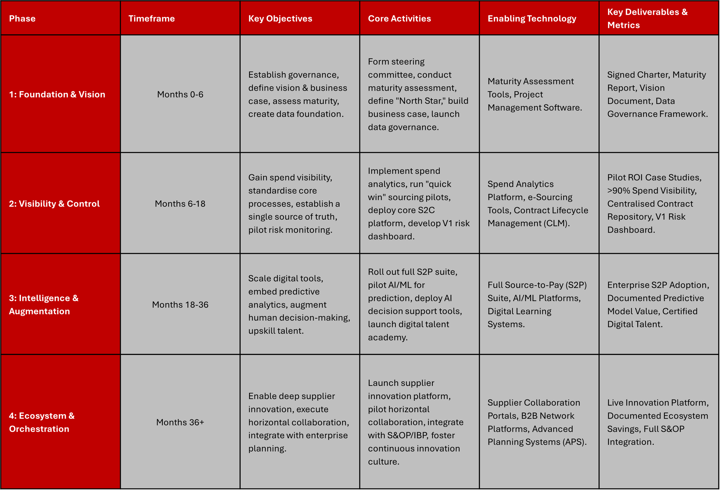Deliverables & Metrics: Documented case studies from successful pilot projects demonstrating ROI; a live spend analytics platform with >90% of addressable spend classified; a live, centralised CLM repository; a V1 supplier risk dashboard; and metrics showing an increase in spend under management and a reduction in sourcing cycle time.